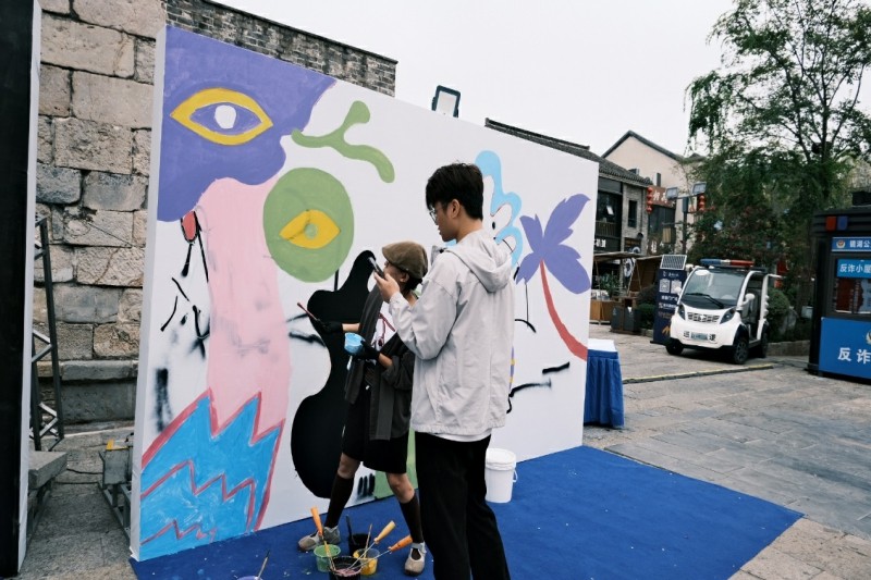 本网讯 2025年9月下旬,芜湖古城举行了野生・青年灵感派对——先锋艺术・青年涂鸦展,艺术设计学院空间设计与表现社团师生受邀参展。 在专业教师张涛的带领下,师生以芜湖古城标志性建筑谯楼广场为创作基地,顺利完成了为期三天的系列彩绘、涂鸦作品《青红皂白》。